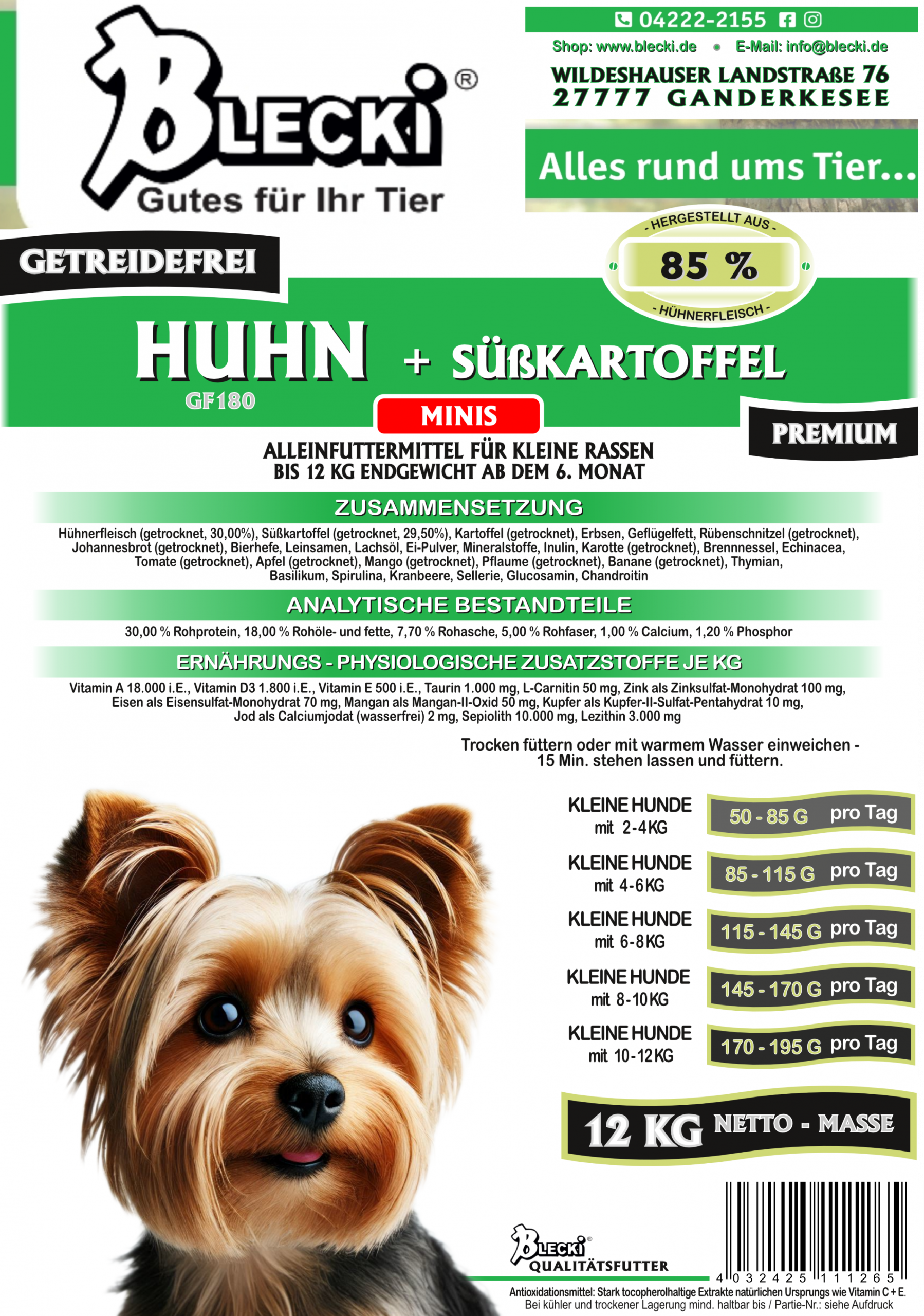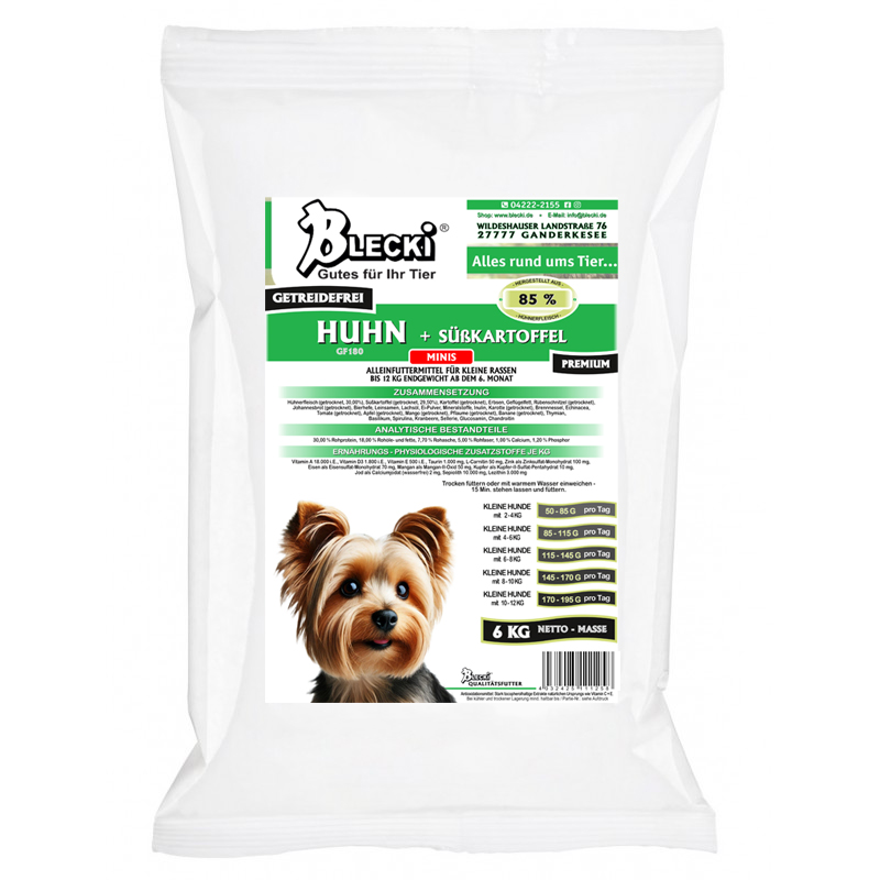 BLECKI GF 180 Huhn + Süßkartoffel Minis 6 kg Alleinfuttermittel für alle Hunde und jedes Alter ab dem 6. Monat